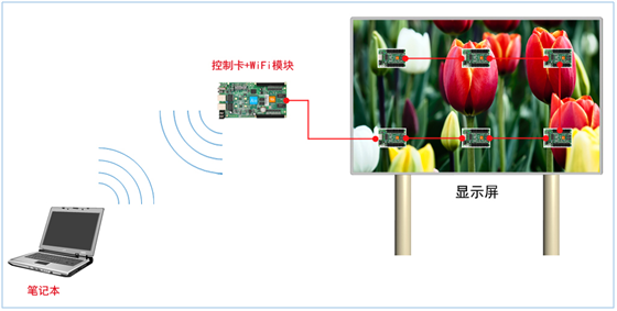筆記本電腦通過無線WiFi連接到異步全彩發送卡,進而實現對LED全彩屏的一對一控制和管理。